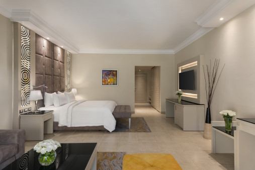 Family Room (garden, pool view, макс. 4 взрослых, 2 спальни (с дверью - "паровозиком"), душ, балкон или терраса, 58 м2, корпус № 4) Diplomatic Suite 148 м2. Элегантно оформленная в современном стиле просторная гостиная соединена с удобной спальней с кроватью размера «king-size». |