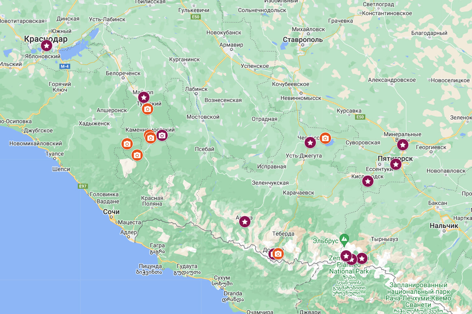 Краснодар – Свято-Михайловский Афонский монастырь – Майкоп (3 ночи, отель Версаль 3*) – Гуамское ущелье* – термальный комплекс «Водная Ривьера»* – Хаджохская теснина* – водопады Руфабго* – Большая Азишская пещера* – Архыз – подъем по канатной дороге «Млечный путь»* – Черкесск (1 ночь, отель Эдельвейс 3*) – термальный комплекс «Жемчужина Кавказа»* – Домбай – гора Мусса-Ачитара* (подъем по канатной дороге) – Пятигорск (2 ночи, отель Бештау 3*) – Национальный парк "Приэльбрусье"* – канатная дорога на Чегет* – канатная дорога на Эльбрус* – Кисловодск – Минеральные воды |