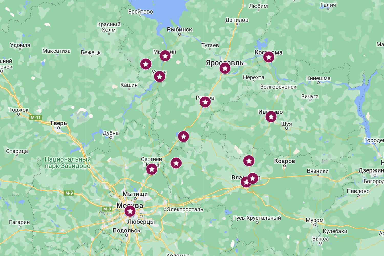 Владимир – Боголюбово – Суздаль – Иваново – Кострома – Ярославль – Ростов Великий – Переславль-Залесский – Сергиев Посад – Александров – Углич – Мышкин – село Мартыново |