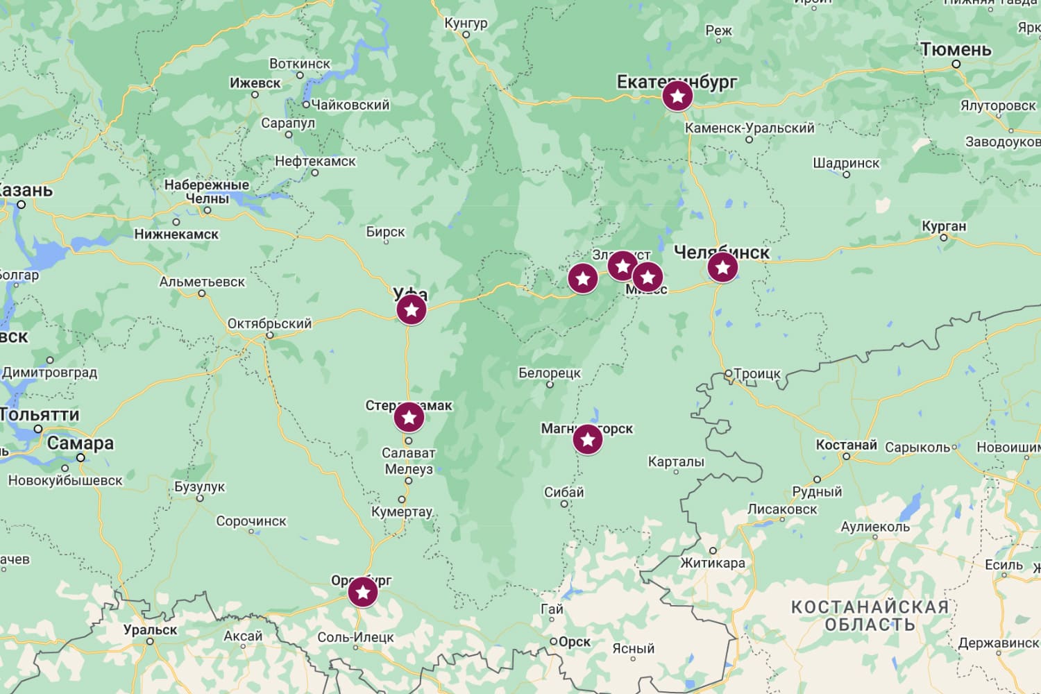 Екатеринбург – Челябинск – Магнитогорск – Оренбург – Стерлитамак – Уфа – Сатка – Златоуст – Миасс – Екатеринбург |