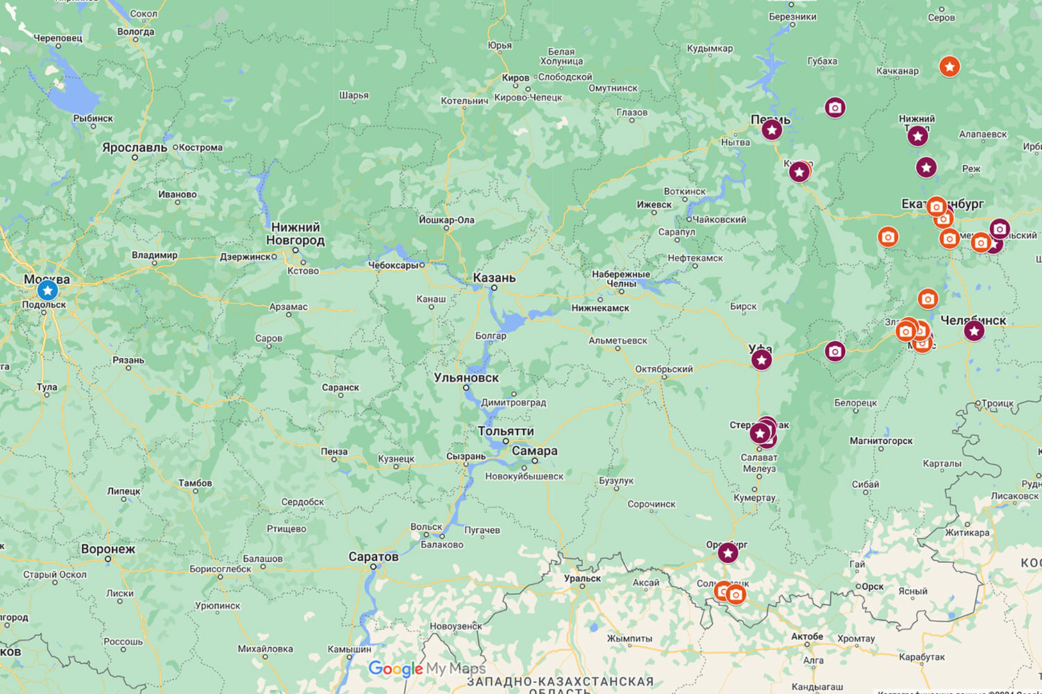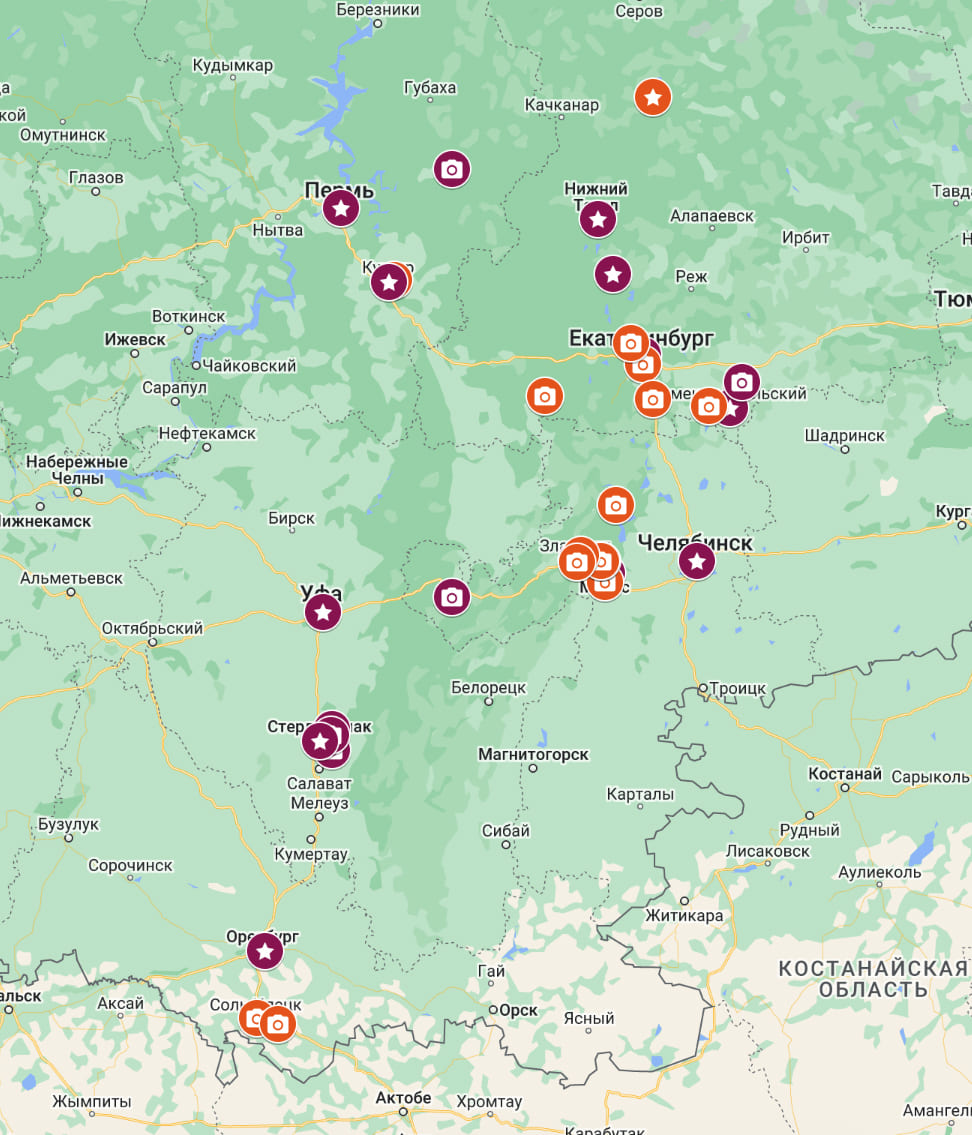 Пермь – Кунгур – Кунгурская ледяная пещера* – Чусовой (этнографический парк истории реки Чусовой) – Нижний Тагил (2 ночи) – Верхотурье* – Невьянск – Екатеринбург (2 ночи) – термальный комплекс "Баден-Баден Термы Уктус"* – Ганина Яма* – «граница Европы и Азии»* – Оленьи ручьи * (трекинг) – фабрика «Фарфор Сысерти»* (мастер-класс по росписи фарфора) – Челябинск – Миасс – дом купца Смирнова* (мастер-класс по лепке пельменей) – озеро Тургояк – остров Веры* – Златоуст (2 ночи) – Национальный парк Таганай* – оружейная слобода «АиРовка»* – Серпиевский пещерный град – Уфа – шиханы Торатау, Юрактау, Куштау – Стерлитамак – Оренбург (2 ночи) – Соль-Илецкие озера* – Казачий курень* |