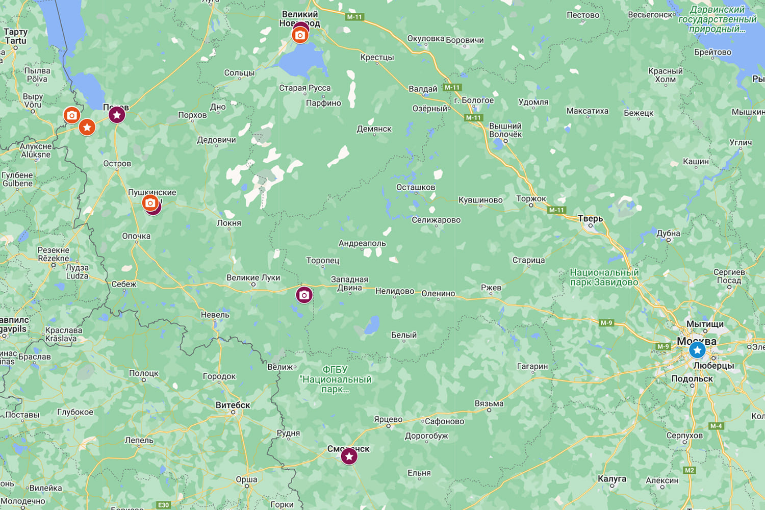 Москва – Великий Новгород – музей "Витославлицы"* – Псков – Печоры – Псково-Печерский монастырь* – Изборск* – Пушкинские Горы – "Тригорское"* – "Михайловское" – Смоленск – Москва |
